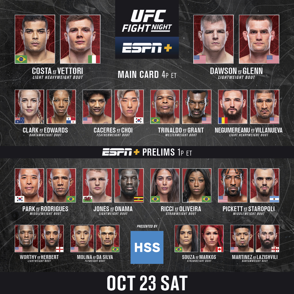 Next weekends UFC Vegas 64 has suffered a big loss according to MMA Fightings Guilherme Cruz. The prelims will start at 9pm BST on Saturday 29 October 1pm PT 3pm CT 4pm ET with the. Find out everything you need to know about every fight on Saturdays main programme.